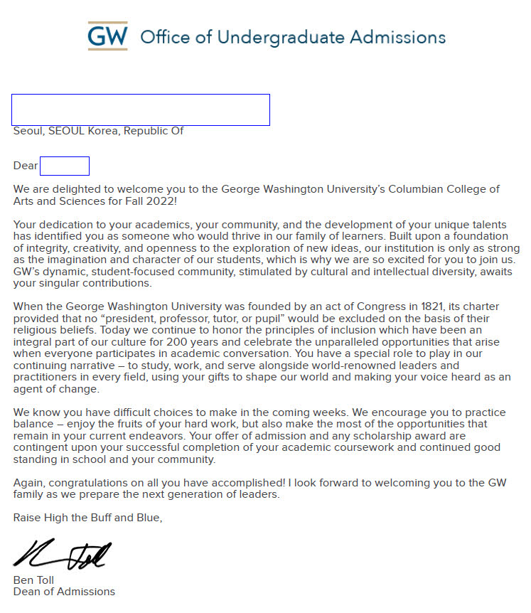 미국의 수도인 워싱턴 D.C. 에 위치한 유서 깊은 미국 최상위권 대학인 조지 워싱턴 대학교에 합격 하였습니다. 가장 1순위로 가고 싶어했던 대학으로 Early Decision 으로 지원 후 합격하였습니다. 합격을 진심으로 축하드립니다.