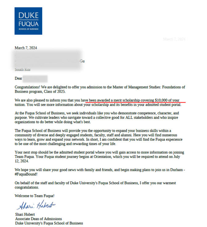 Duke University 의 경영대학인 Fuqua School of Business 는 Business School 전미 랭킹 12위의 명문대학원입니다. 학교의 명성 뿐만 아니라 노스캐롤라이나에 위치하여 학업 환경도 매우 좋은데요 장학금 $10,000 offer 받고 합격하였습니다. 합격을 진심으로 축하드립니다.!