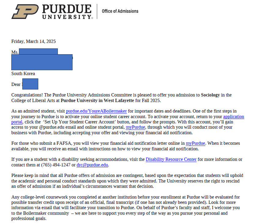 국내 대학을 다니다 미국 편입을 문의하셨던 학생입니다. 부족한 선수과목이 있어 UCLA Extension에서 크레딧을 이수하는 것을 추천 드렸고, GPA 4.0/4.0, TOEFL 105점의 뛰어난 성적으로 Purdue University 의 사회학과(Sociology) 편입에 합격했습니다! 미국 명문대 편입을 목표로 체계적으로 학점을 쌓고, 영어 실력까지 완벽히 준비한 사례로, UCLA Extension 학점 이수가 편입 성공에 큰 기반이 되었습니다. 사회학 분야에서 세계적으로 높은 평가를 받는 UCLA에서의 새로운 시작을 진심으로 축하합니다!