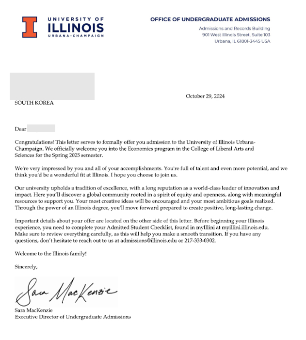 미국 대학교 송도 국제 캠퍼스에서 GPA 3.7 이상의 성적과 100점 이상의 토플 성적으로 UIUC 경제학과(Economics)에 편입 합격한 학생의 멋진 성과를 전합니다! UIUC는 미국 공립대학 중 상위권에 속하며, 경제학 분야는 세계적으로도 인정받는 전공 중 하나입니다. 국제캠퍼스 재학 중 체계적인 학업 계획과 영어 준비를 통해, 경쟁력 있는 성적으로 편입을 이뤄낸 사례입니다. 학점도 대부분 인정을 받고 이제는 미국에서 학업을 할 예정이며 앞으로의 여정도 응원합니다.~