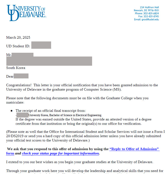 Computer Science 석사(MS) 과정에 최종 합격했습니다!