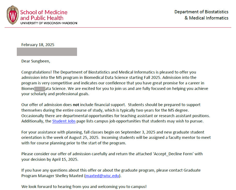 의학과 데이터 과학의 융합 분야로 주목받는 Biomedical Data Science 석사과정(MS)에 미국 공립 명문대학인 University of Wisconsin?Madison 합격하였습니다~ 위스콘신 매디슨은 생명과학, 헬스케어, 인공지능·데이터 기반 연구에서 세계적인 명성을 가진 연구중심 대학으로, 국내에도 많은 졸업생 네트워크가 형성되어 있는 학교이기도 합니다. 특히 바이오메디컬 데이터 분야는 정밀의료와 디지털 헬스 시대를 선도하는 핵심 전공으로 각광받고 있습니다.