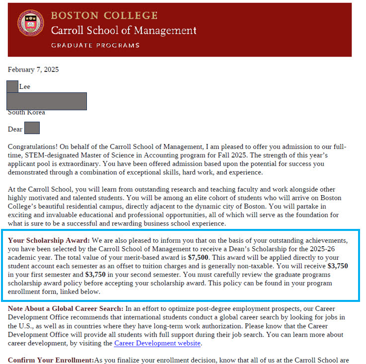 보스턴 컬리지 (Boston College) 회계학 석사 (MS in Accounting) 합격 후기 & 장학금도 수혜