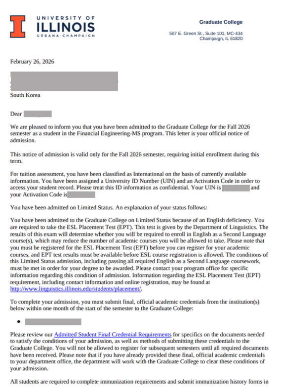 ※ 아래 내용은 University of Illinois, Urbana-Champaign (Champaign) 에 합격한 정*희 님이 직접 작성한 후기로, 보내주신 사진과 함께 업로드 하였습니다.