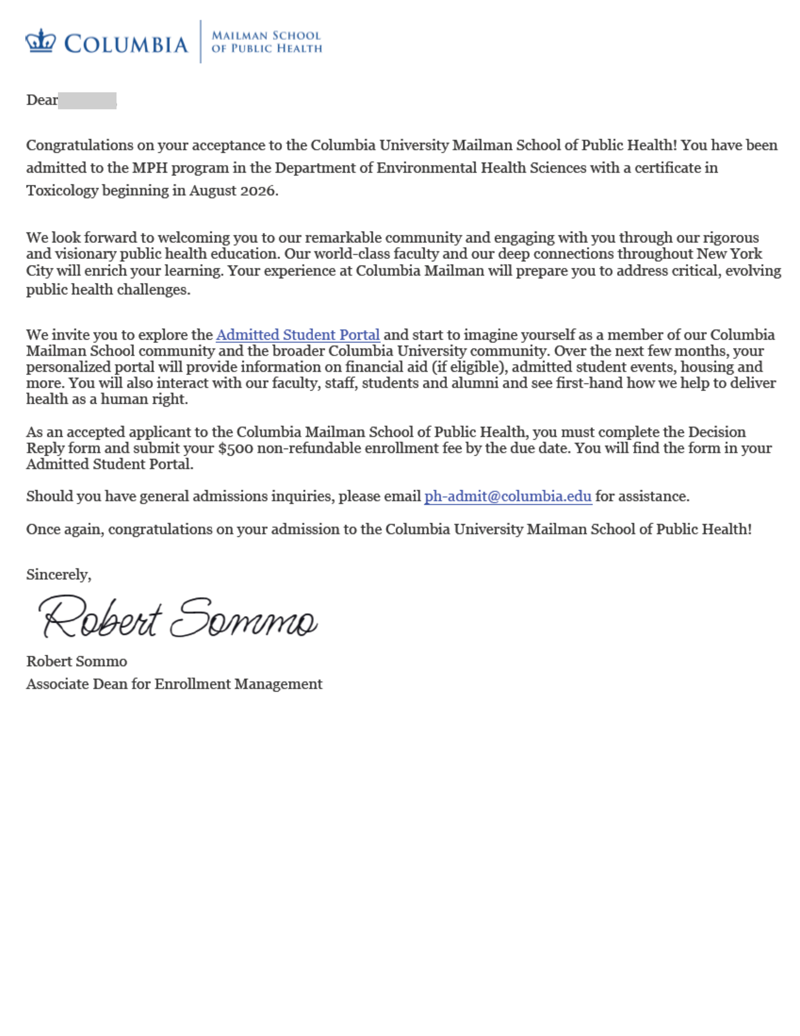 컬럼비아 대학교 (Columbia University) 의 보건 대학원 Mailman School of Public Health Public Health 석사(MPH) 합격을 진심으로 축하드립니다. Mailman MPH는 APEx(현장 실습·practicum)처럼 수업에서 배운 내용을 실제 기관/프로젝트에 적용하는 과정이 필수로 포함돼, “공부가 곧 경험”으로 이어지기 좋은 커리큘럼을 가지고 있습니다. 또한 U.S. News & World Report 기준 랭킹 4위로 전 세계에서 많은 학생들이 지원하는 대학원입니다.