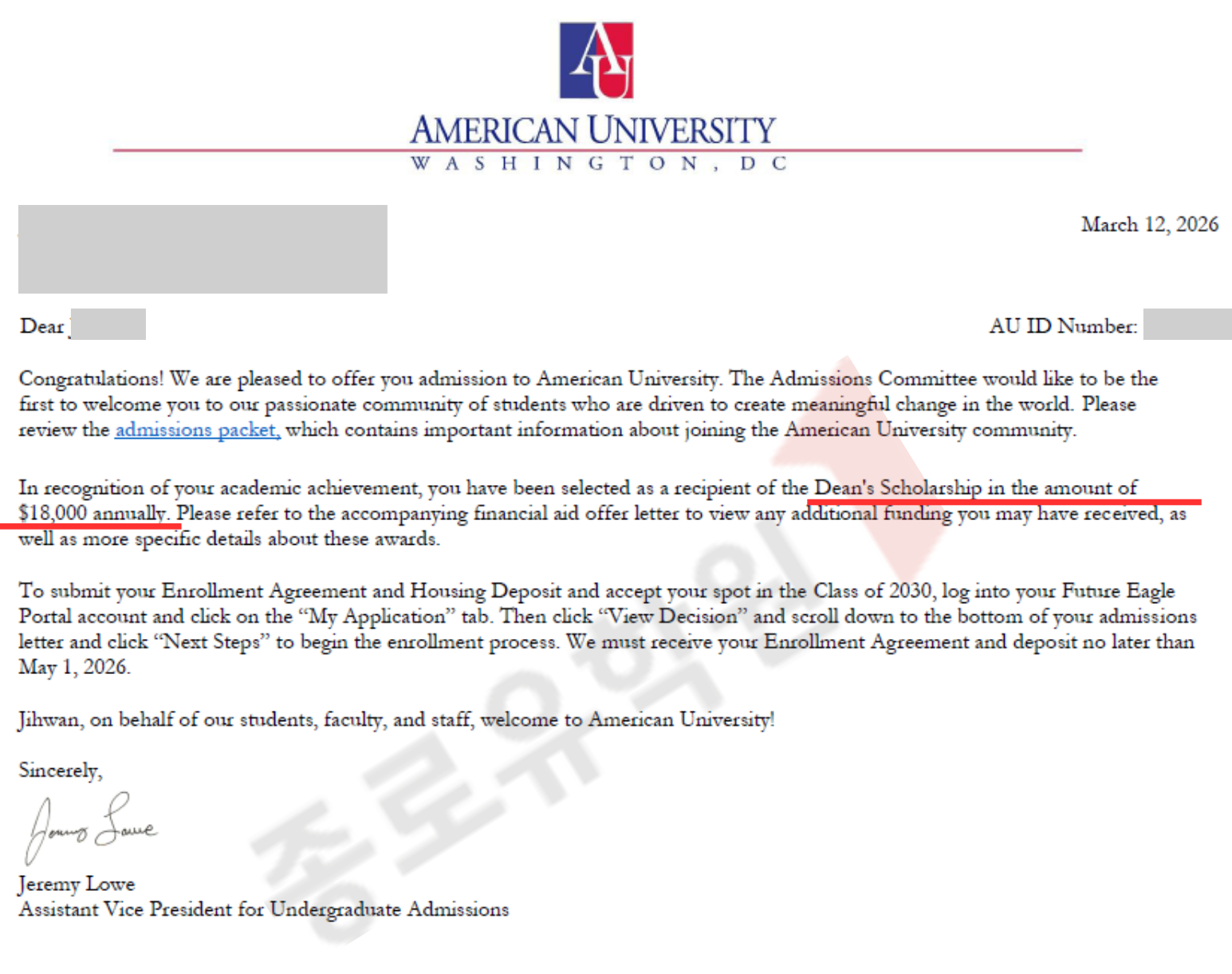 종로유학원과 함께 미국 대학 신입학을 준비한 이*환 학생이 워싱턴 D.C.의 정치 명문, 아메리칸 대학교(American University)로부터 합격과 동시에 장학금 소식을 전해왔습니다.