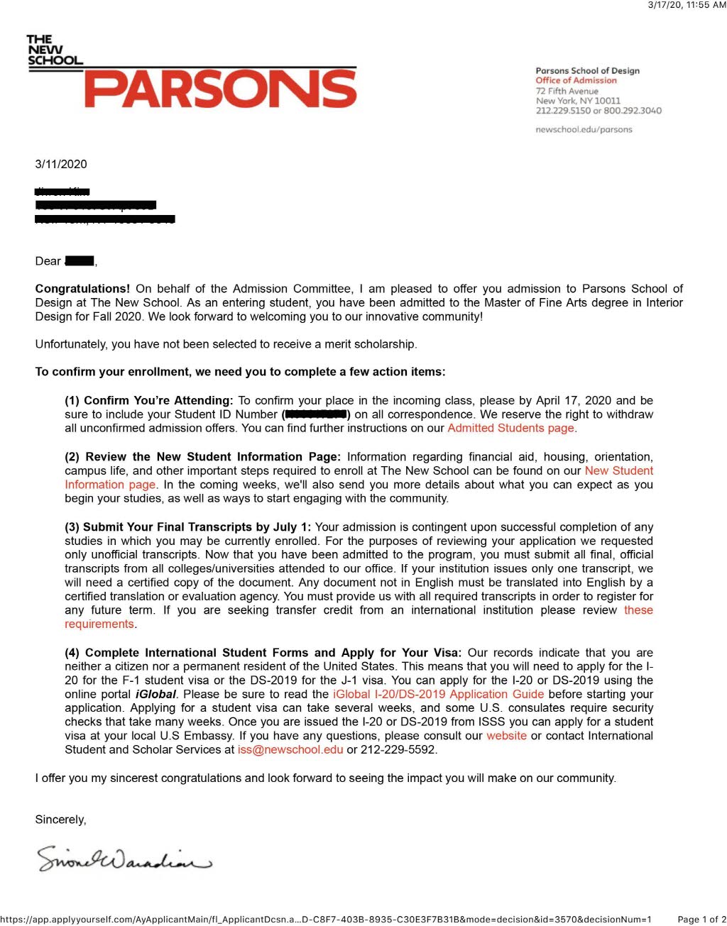 Parsons School of Design Interior Design 전공으로 2020년 가을 학기에 합격 하였습니다!