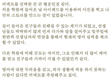 그러나 시간이 많이 지난 만큼 내 영어 실력도 많이 는 것 같아 뿌듯하다. 물론 아직도 정말 많이 부족하지만 이 곳 커넥트에서 영어를 즐기고 있는 내 모습을 볼 때면 두려움보다 ‘할 수 있다’는 생각이 강하게 든다.