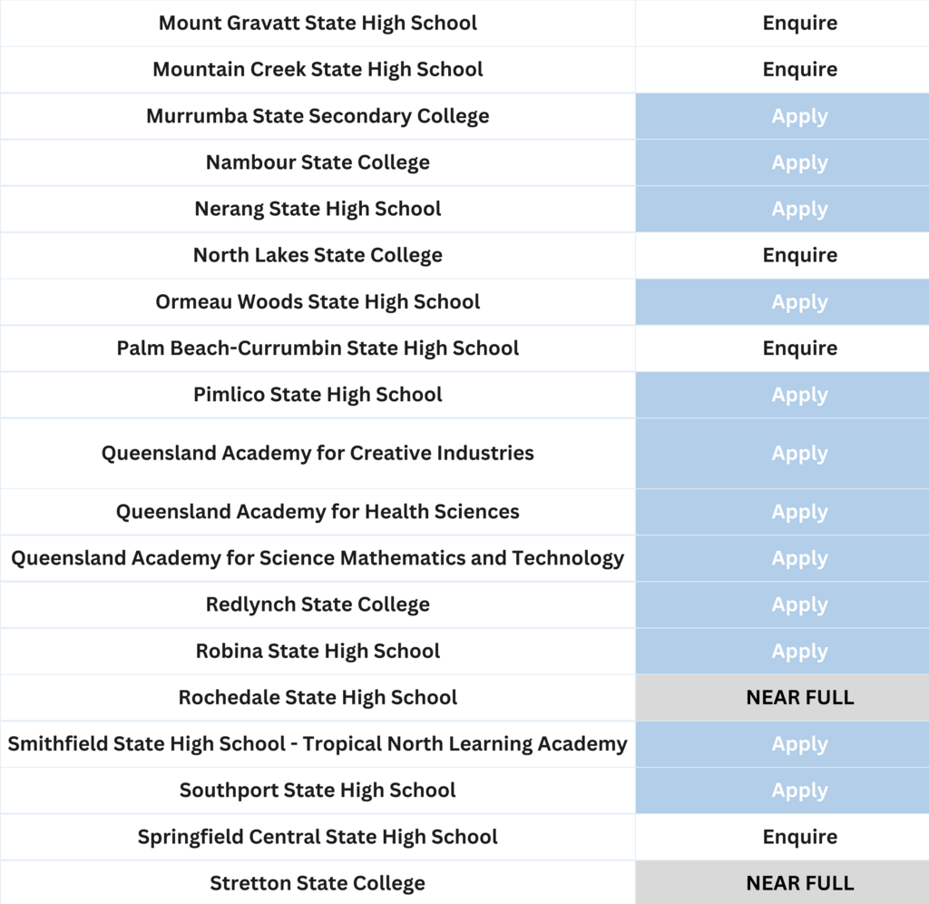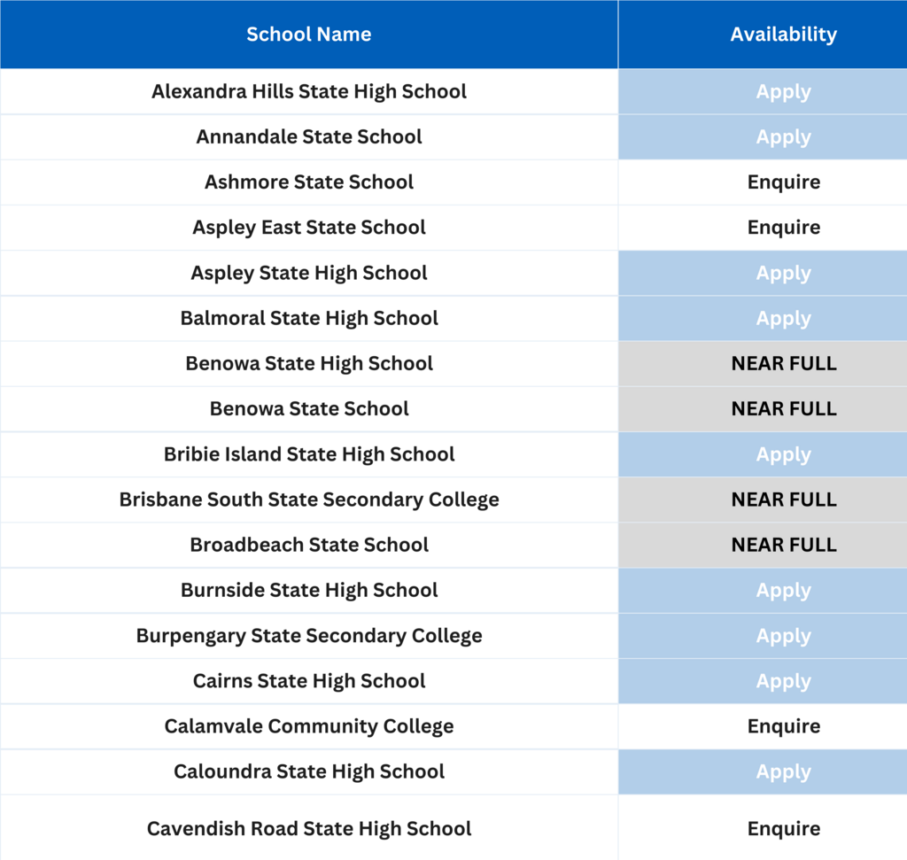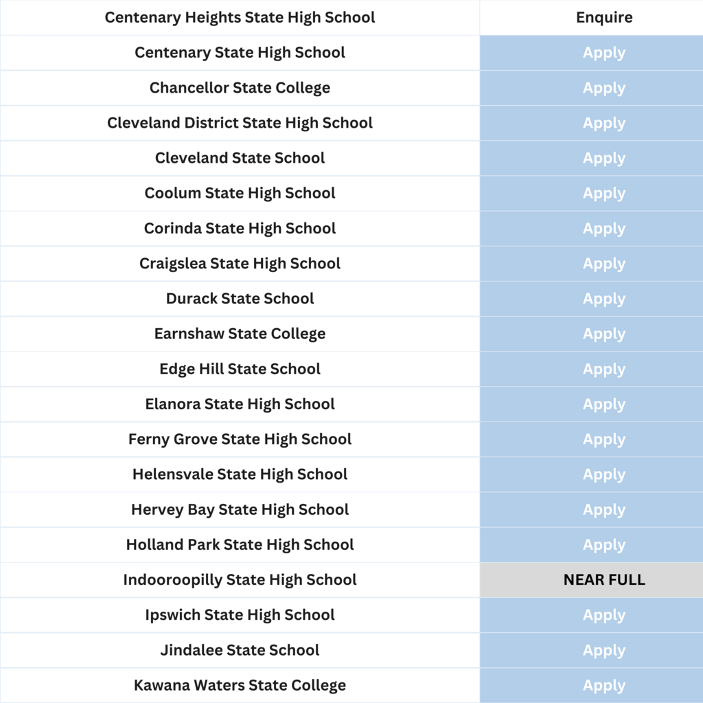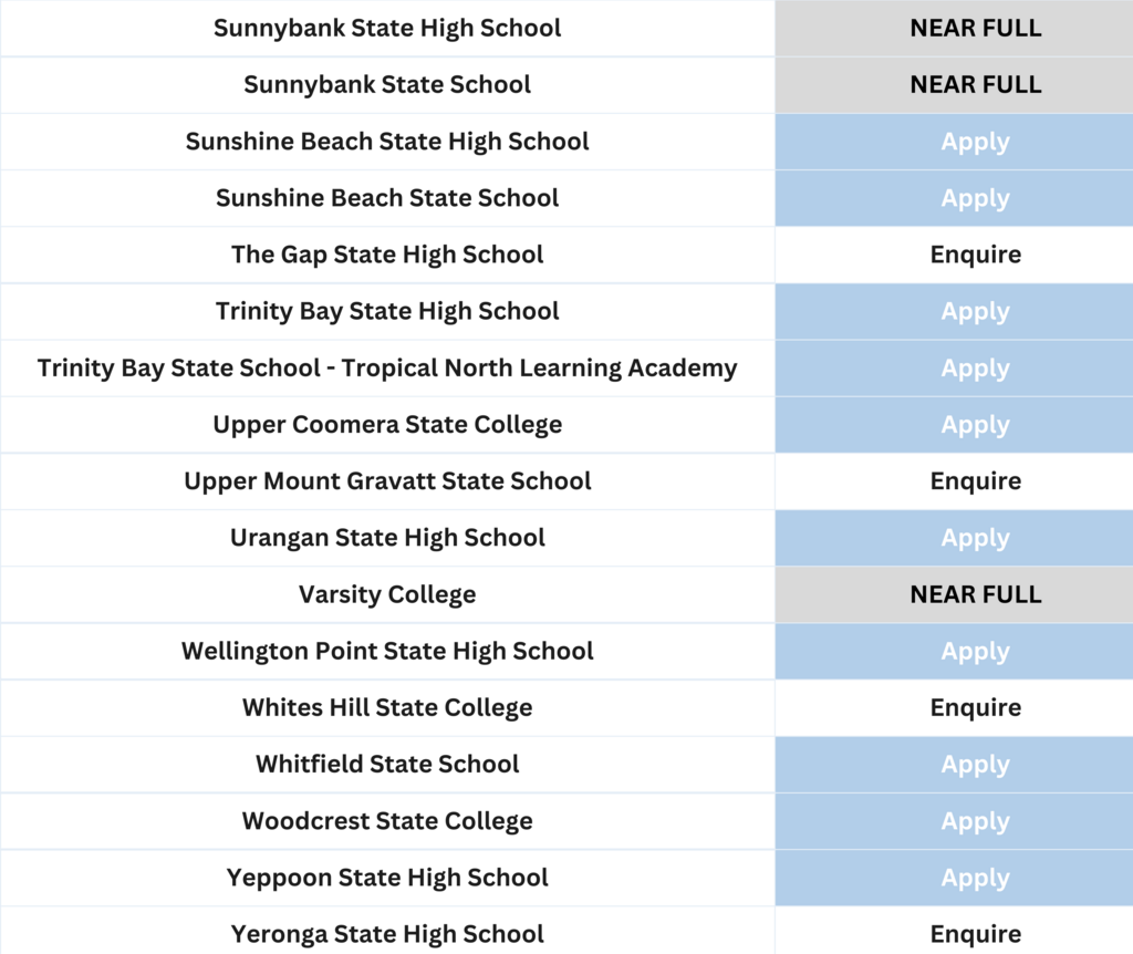 퀸즐랜드주 교육청(EQI)에서 발표한 학교별 현황입니다. 'NEAR FULL'로 표시된 학교는 정원이 거의 마감되었음을 의미하므로 서둘러야 합니다.