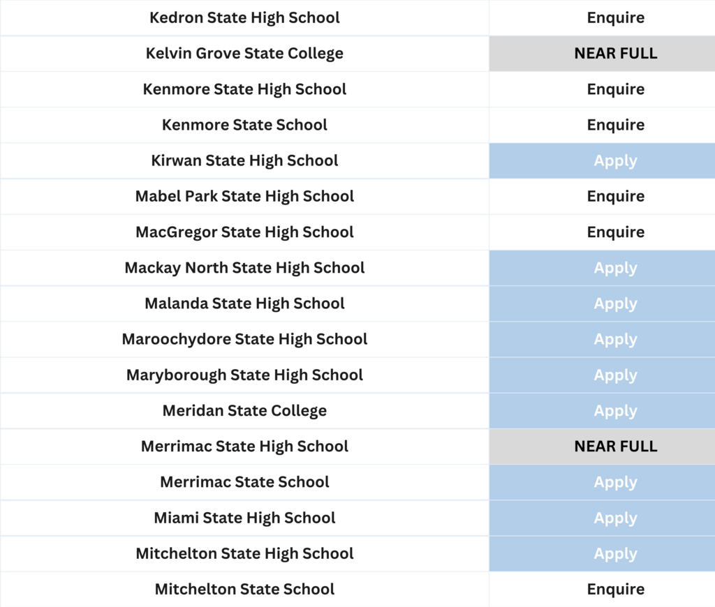 브리즈번 공립학교 입학 가능 여부 리스트 (C ~ I)켈빈 그로브(Kelvin Grove)와 메리맥(Merrimac) 등 주요 주거 지역의 정원 현황입니다. 'Apply' 버튼 활성화 여부를 체크하세요.