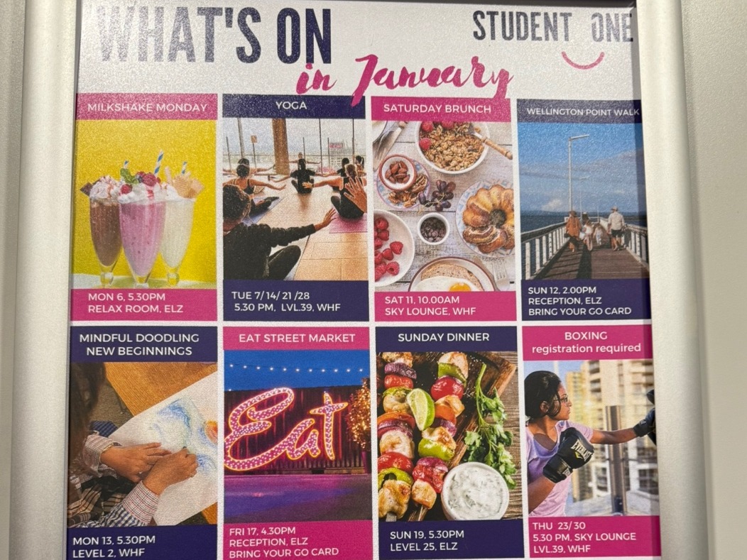 Student One은 학생 전용 기숙사라 그런지 국가별 학생들이 친해질 수 있는 재밌는 활동을 정말 많이 제공해요. 엘리베이터에 매달 말쯤 되면 다음 달에 열릴 행사 달력이 붙는데, 이걸 꼭 체크해야 합니다!