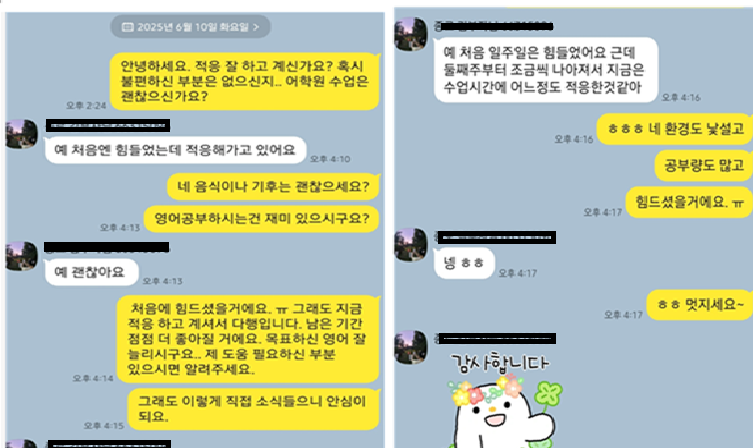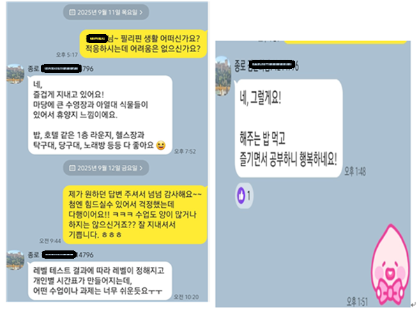평생 학생들을 가르쳐오신 영희 님은 명예퇴직 후 '오직 나만을 위한 공부'를 꿈꾸며 세부 CIA 어학원으로 떠나셨어요. 낯선 환경에 걱정도 많으셨지만, 현지에서 보내주신 카톡에는 설렘이 가득했습니다.