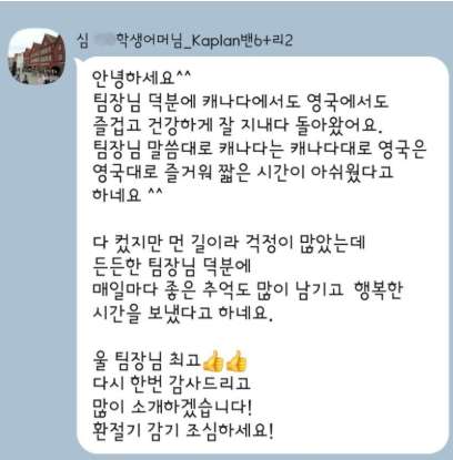 "팀장님 덕분에 캐나다에서도 영국에서도 즐겁게 잘 지내다 돌아왔어요. 팀장님 말씀대로 캐나다는 캐나다대로 영국은 영국대로 즐거워 짧은 시간이 아쉬웠다고 하네요. 울 팀장님 최고 !!"