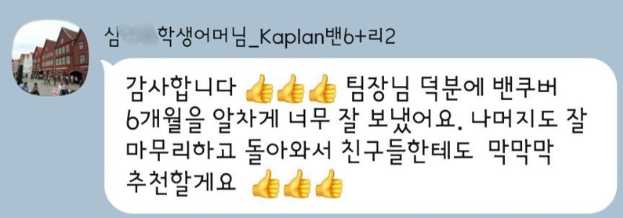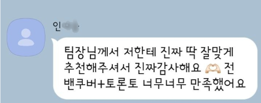 "팀장님께서 저한테 진짜 딱 잘 맞게 추천해 주셔서 정말 감사해요~ 전 밴쿠버+토론토 너무너무 만족했어요"